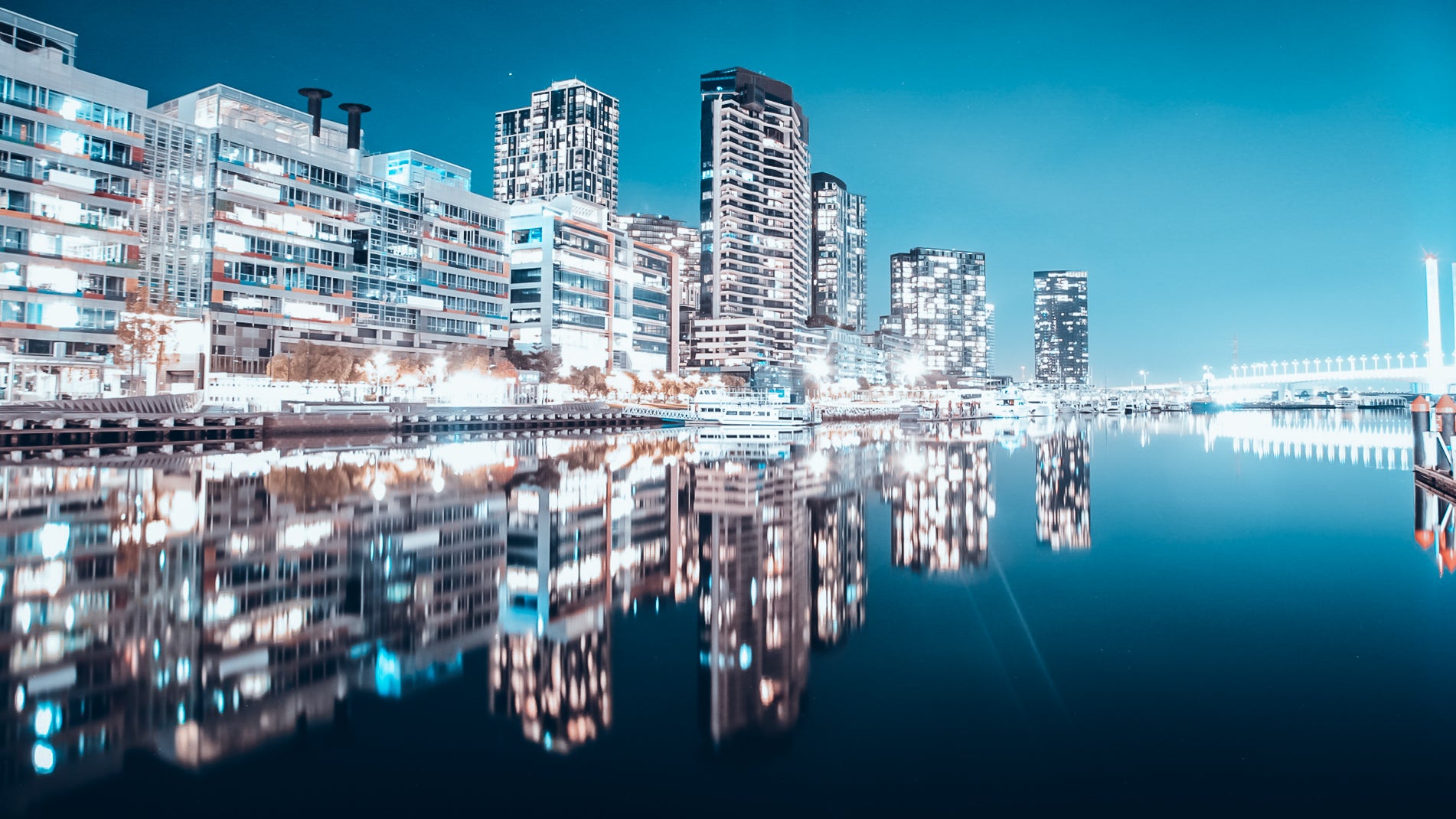 Shot by Mercz Media. A striking night view of the city skyline mirrored perfectly on still waters, creating a sense of balance and modern elegance. This premium wall art adds sophistication and urban energy to any space, available framed or as canvas.